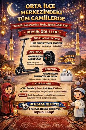 Ramazan ayı boyunca Orta ilçe merkezimizdeki tüm camilerimizde, 18 yaş altı gençlerimiz teravih namazlarına ve Ramazan etkinliklerine katılımları oranında puan toplayacak, topladıkları puanlar doğrultusunda afişte belirtilen esaslara göre ödüllendirilecektir.